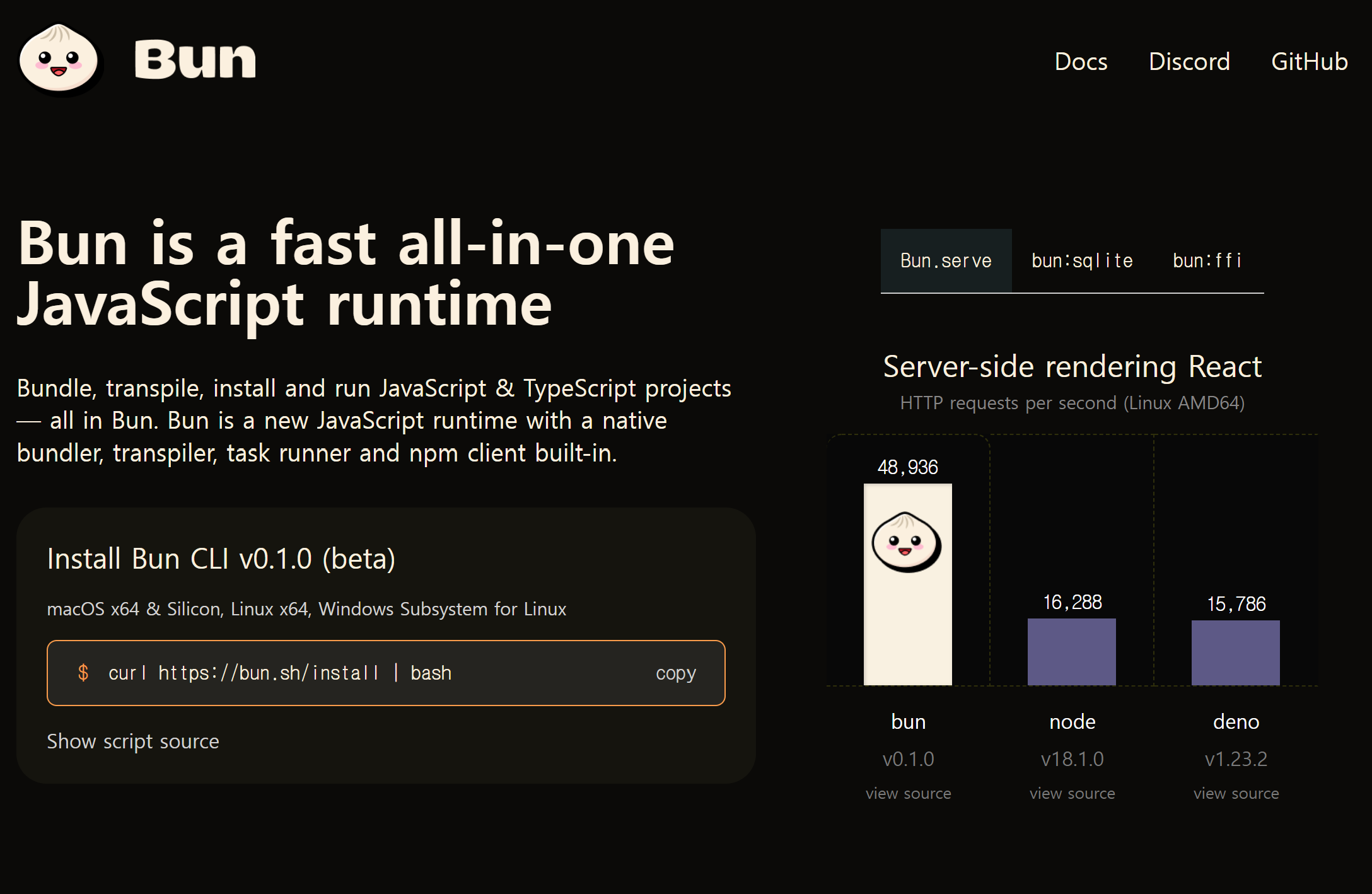 Bundle, transpile, install and run JavaScript & TypeScript projects – all in Bun. Bun is a new JavaScript runtime with a native bundler, transpiler, task runner and npm client built-in.